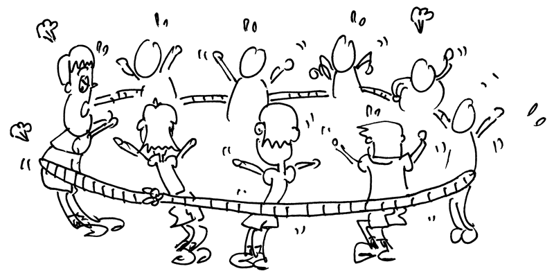 - Without moving their feet and without dropping the rope, ask the players to try to move the knot (tied using the 2 ends of the rope) one full circle around the group.