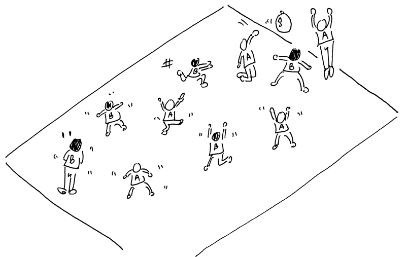 • A member of each team stands at opposite ends of the room, facing their counterpart across. This person is the ‘goal post’.